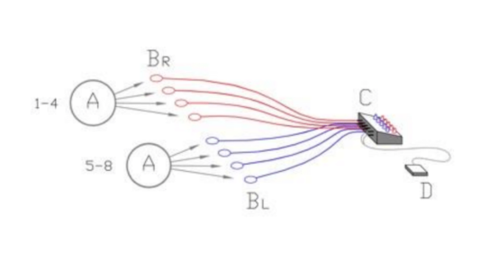 A–objecto B–elementos piezo-eléctricos C–mesa de mistura D–gravador.