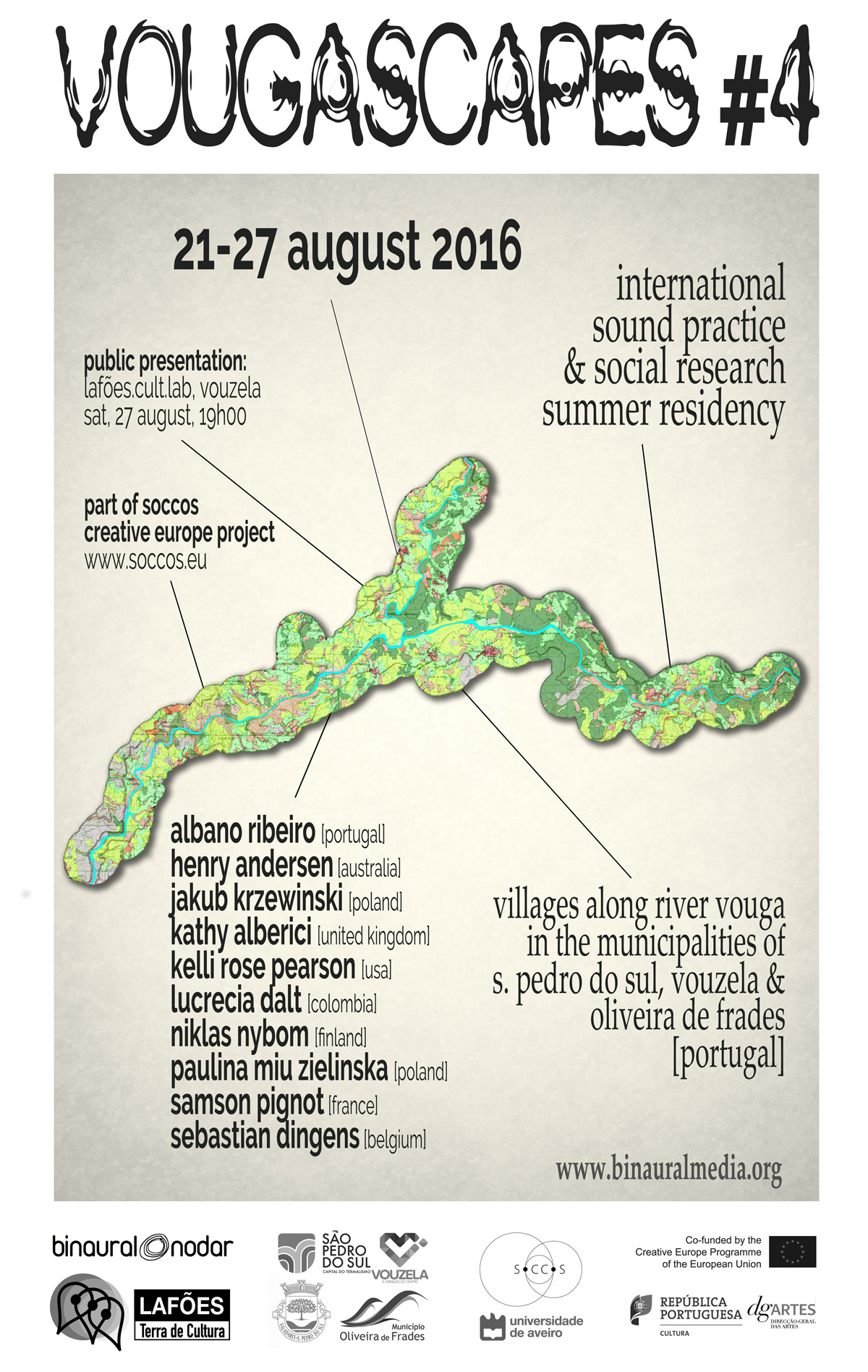 VOUGASCAPES#4 is part of SoCCoS – An European network of sound art residencies funded by the Creative Europe Programme and that includes the following main partners: Binaural/Nodar (Portugal), QO-2 (Belgium), CTM/Disk (Germany), Hai-Art (Finland) and A-I-R Laboratory (Poland).